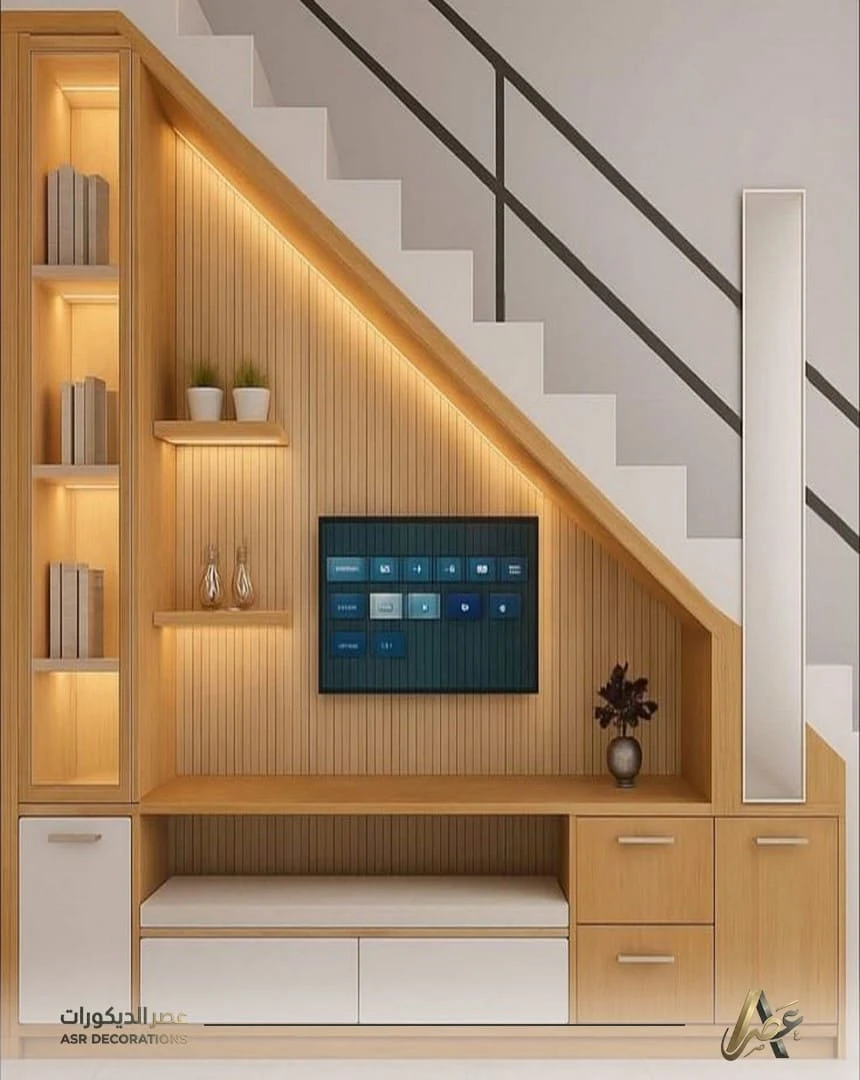 رفوف تحت الدرج سيهات، ديكور اسفل الدرج الظهران، عمل ديكور تلفاز تحت الدرج الدمام