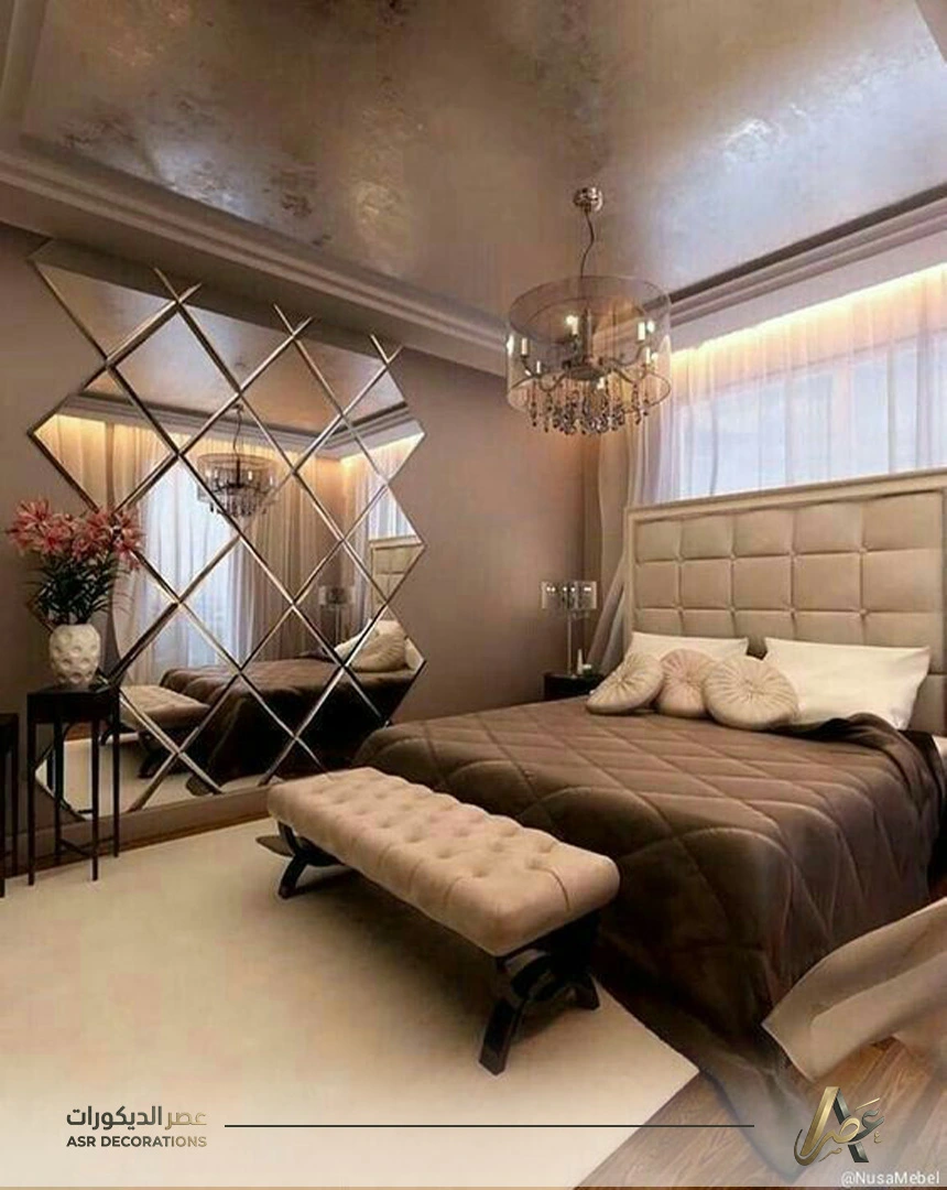 - كذلك المرايا اللي تجي نص دائرة خلف الأباجورات تعطي الغرفة طابع فنادق الـ 5 نجوم وتخليها تشرح الصدر خصوصاً لو كانت تعكس إضاءة طبيعية من الشباك.
